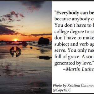 “Everybody can be great… because anybody can serve. You don’t have to have a college degree to serve. You don’t have to make your subject and verb agree to serve. You only need a heart full of grace. A soul generated by love.” ~Martin Luther King, Jr. Photo by Kristina Casanova Law @CapeKLC